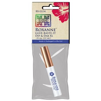 Roxanne Glue Baste It Dip and Dab .34 oz (10ml) It is the perfect answer for little jobs that need a delicate touch. Temporary basting for fabric appliques, hems, quilt bindings and more. Hold any sewing or craft projects without pins or clips. Gently secures paper project layers in place. Fast fix for on-the-go repairs. 100% water soluble, pH neutral, dries clear and flexible and holds firmly until moistened or washed.