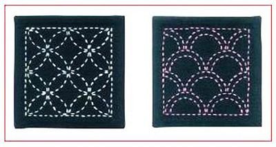 Includes printed navy fabric pink and white sashiko thread and gold-eye sashiko needle. Package is topped with a hook for hanging. Pattern Shippo-tsunagi & Seigaiha