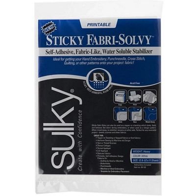 Another Printable Water Soluble! Works just the same as Fabri-Solvy only it has a self-stick back, which is accessed by removing a release sheet. It”s like magic for turned applique Stitch it, turn it, and stick it. It holds items in place for hoopless and reversible embroidery. Ideal for accurate placement of loose items when making scarves or thread collages. Photocopy designs onto it, then peel off the release sheet and stick the design in place for Hand Embroidery, Applique, Punchneedle, Machine and Hand Quilting. With no paper component, it washes away quickly and completely every time! 12 sheets per pkg.