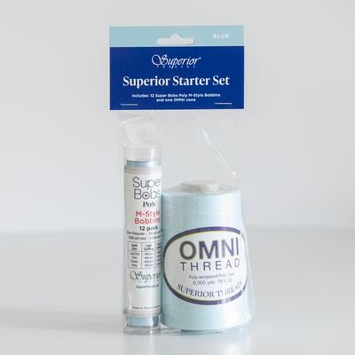 Superior Starter Set Blue: Superior Starter Sets are a great way to get started on your quilting journey. Take the guess work out of how much thread do you need and how many bobbins to wind. These sets include enough thread and pre-wound bobbins to create your first few quilts. All Superior Starter Sets are neutral colors so you will be able to use the thread in multiple projects. Set includes one OMNI #3087 Blue Ice 40wt polyester cone Poly-wrapped poly core thread. 6,000 yds and one package of Super Bobs Poly #634 Baby Blue pre-wound bobbins 12pk M style, 240 yds Per Bobbin – Total per pack 2880 yds.