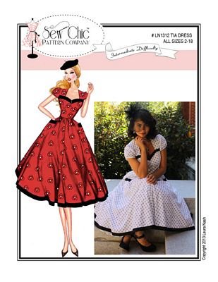 This dress has it all: fitted, full, fun and flirty! The close fitting and fully lined bodice has princess seams at bust, separate midriff and shoulder with gathered cap sleeve and side closure. The flared skirt, gathered at the waist, completes the feminine silhouette. The contrast trim on bodice, hem, and patch pockets are taken from purchased bias binding, and can really play up the colors in your fashion fabric. Make your own bias trim for formal fabrics, or omit the trim or pockets for a different look.