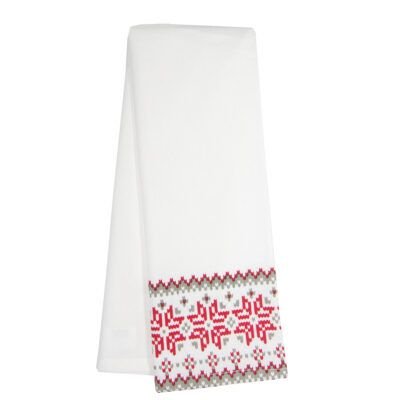 100% Cotton Tea Towel Nordic Style Snowflakes border on white. Contains 1 package of 6 towels 20 in x 27 in.