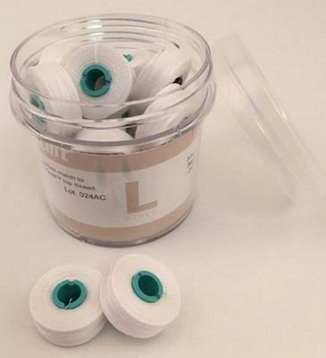 Fil-Tec Magna-Quilt Prewound Bobbins Egyptian Long Staple Mercerized Cotton No. 50/2 (Tex 24). Has the look of cotton but has the strength and colorfastness of polyester. The magnetic core rotates the bobbin consistently throughout the entire bobbin which results in uniform tension to the last stitch. Consistent tension throughout the bobbin increases stitches per bobbin. This equates to more time quilting and fewer bobbin changes. No backlash or overspin issues. 20 L-style prewound bobbins per jar/74 yards of thread per bobbin. FILTEC