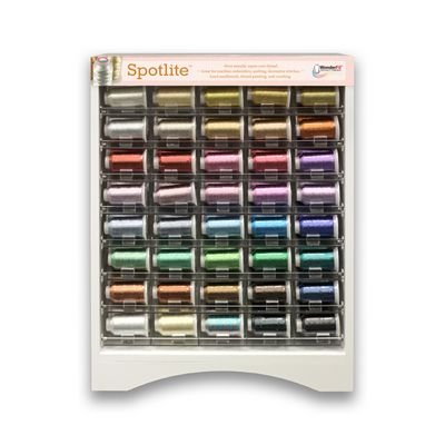 ULC – Spotlite – 40wt rayon core metallic in 1000m spools, 40 glittery colors, 5 spools per color on ULC cabinet display. Total 200 spools. Spotlite is a rayon-based metallic that is smooth running and soft to the touch. Runs at up to 1000 spm with domestic and long arm machines. Measurements: 16.5″ wide x 21.5″ high x 8.5″ deep *Drop Ship* **Freight Intensive** Billable transportation charges for freight intensive items will be the greater of the dimensional weight compared to the actual weight. In addition to transportation charges, freight carriers may assess an additional oversize charge per package.